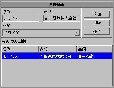 Word registration is now completed. Click 終了(Done) to exit the word registration dialog. The next time you enter the phonetics よしでん (yoshiden), VJE will convert it into 吉田電気株式会社.