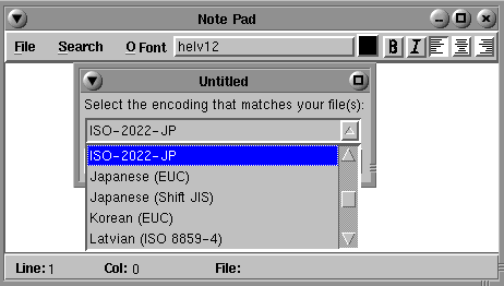 Note: 既存の日本語ファイルをエディタで開く場合にも、最初にそのファイルのエンコード方式を指定します。これを怠ると、デフォルトのエンコード方式と、開くファイルのエンコード方式が違う場合、文字化けが起こります。ファイルを開こうとして文字化けが起こった場合は、違うエンコードを指定してからもう一度ファイルを開いてみてください。